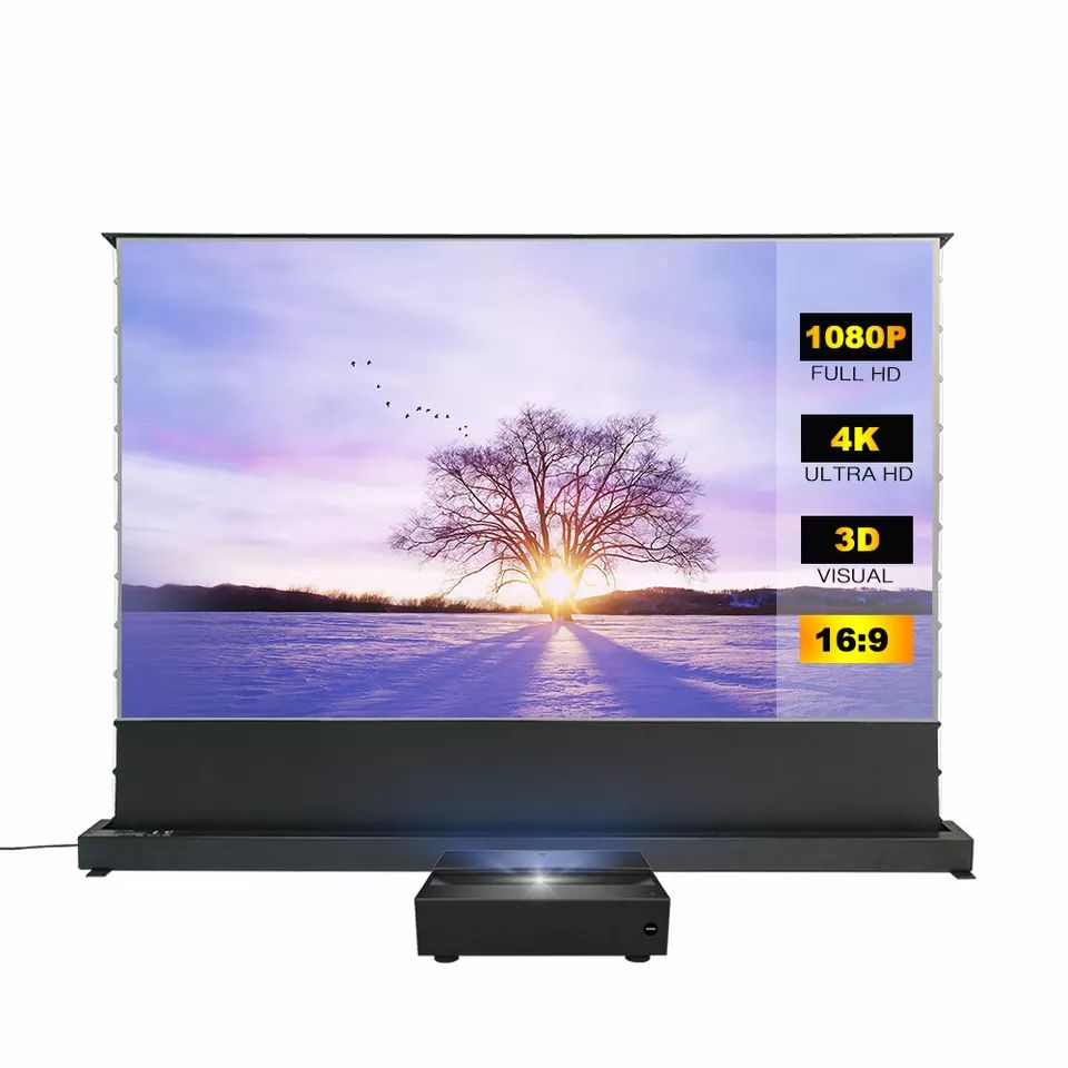 5) Экран проектора моторизованного напольного уровня - это использование для технологии выдвижного напряжения. Плодость, как стеклянная поверхность, и выдвигается вверх от пола. Когда экран не используется, просто закройте его, что делает его ненавязчивым.